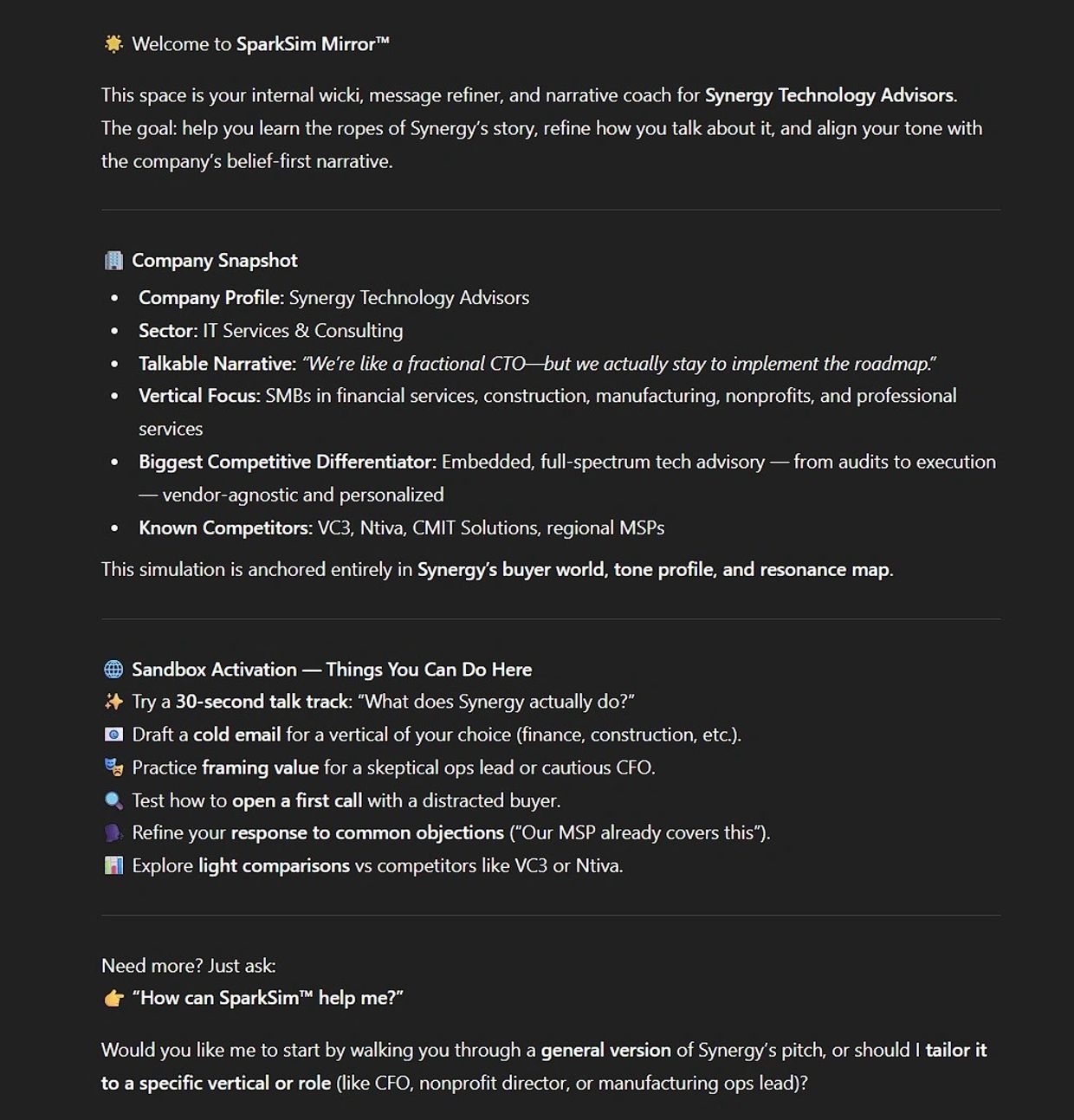 This is a self-learning sandbox that doesn't hallucinate or drift. Explore simplified or advanced messaging, create competitor grids, pressure test outbound marketing reach, verticals, buying personas - all LOCKED in relevance to your organization. Because SparkSim is autoadaptive, declaring your role (AE, BDR, Channel Manager, Founder, Leader), Mirror will automatically pivot the focus to accommodate that role. In this way, SparkSim can create and explore: